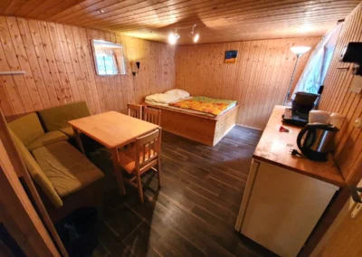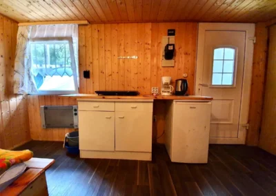 Jeder unserer Bungalows ist mit einer praktischen Kochecke ausgestattet – inklusive zwei Herdplatten, Kühlschrank, Kaffeemaschine, Wasserkocher und einer Grundausstattung an Geschirr und Kochutensilien. Für den Abwasch stehen Ihnen die modernen Sanitäranlagen zur Verfügung.